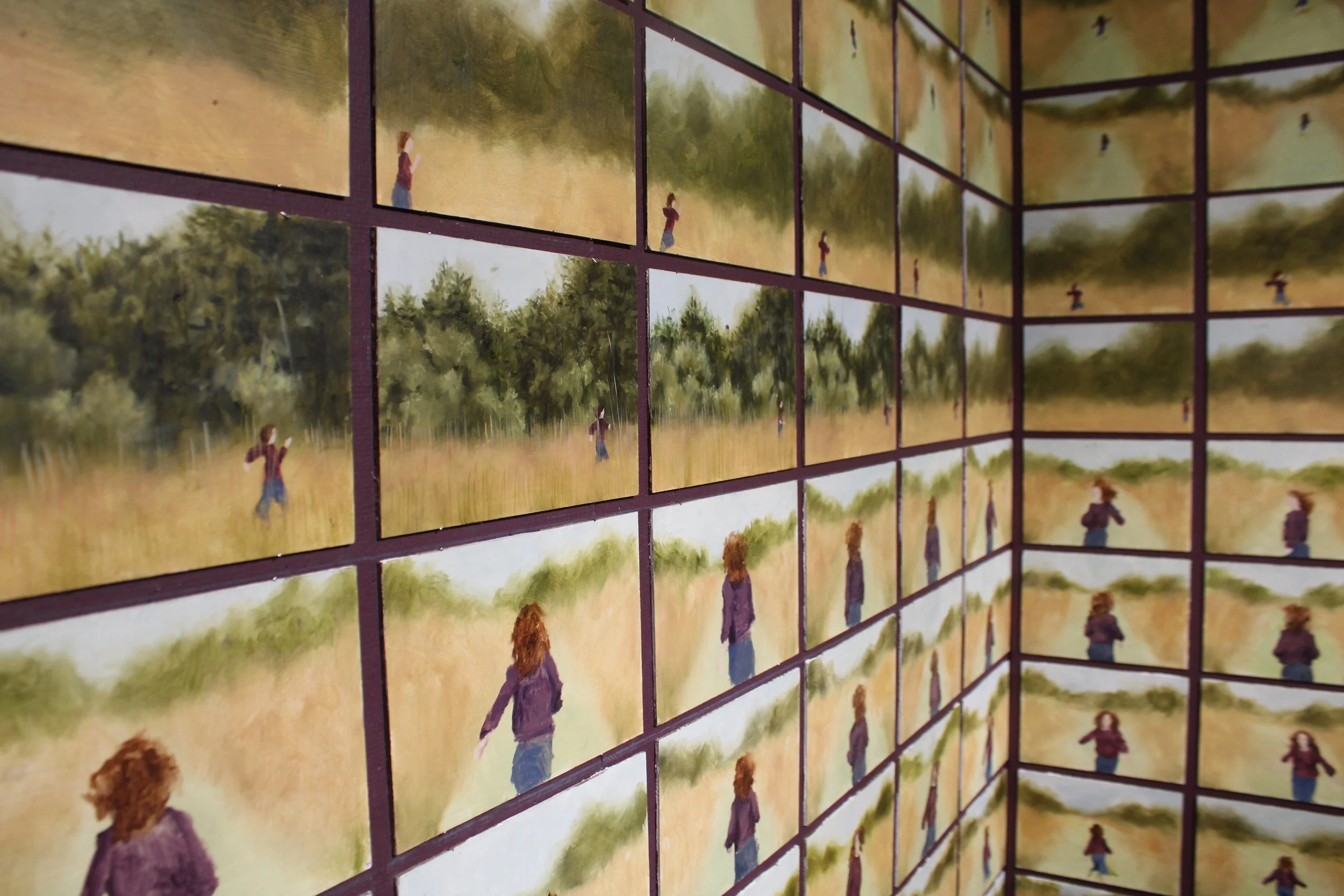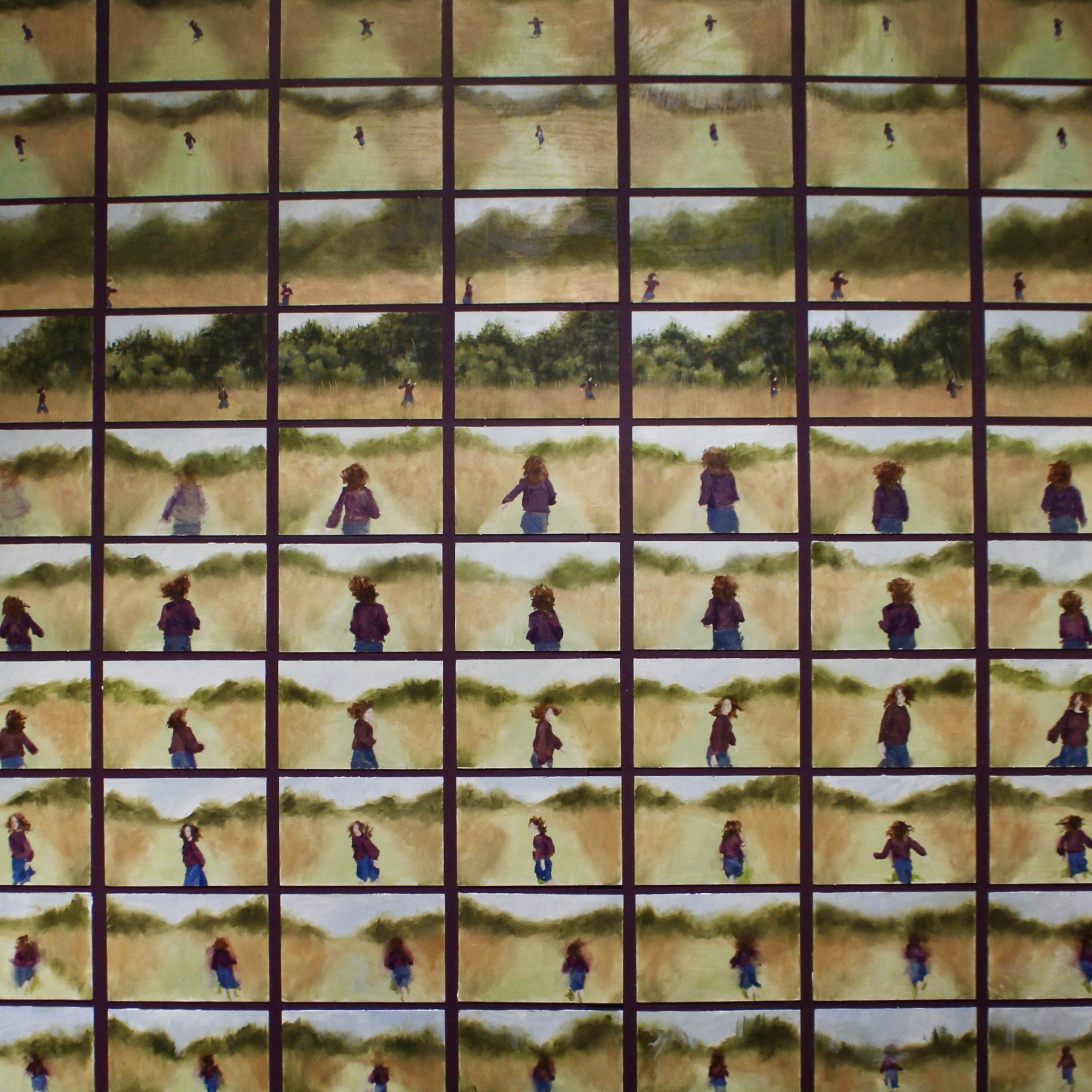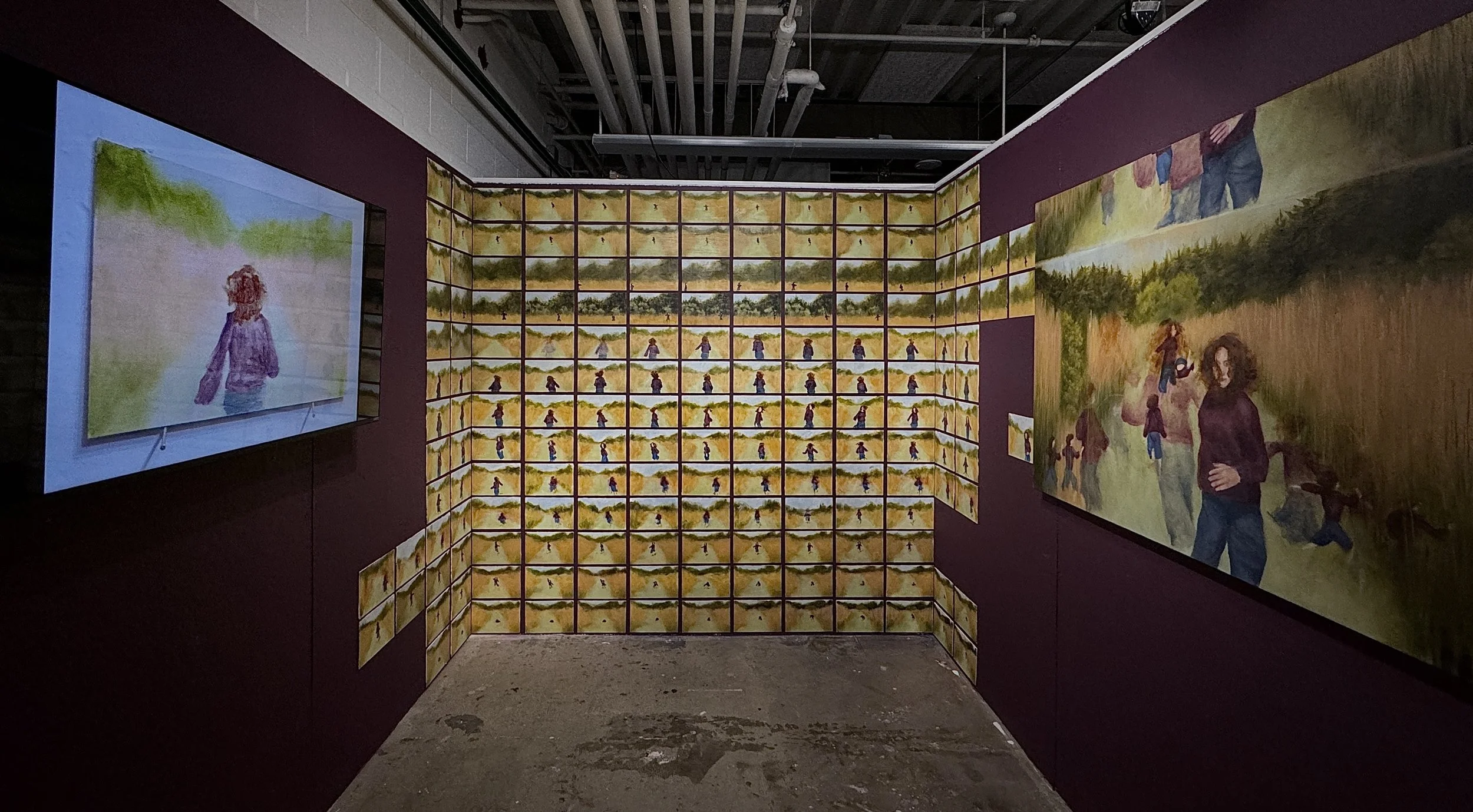 Perpetuation is the tangible product of continuous musings of time, explored through 174 sequential panels reduced to a seventeen second video, and reproduced in a large scale oil painting. The three walls of this installation represent three different interpretations of time: linear, cyclical and simultaneous. The process in which I created each piece also resembles its intention. I painted the panels in the order of their sequence, while concurrently working on the larger piece. The repetition of documenting, uploading, and editing each panel mimicked its cyclical nature. Each step presented a discovery that informed the others.